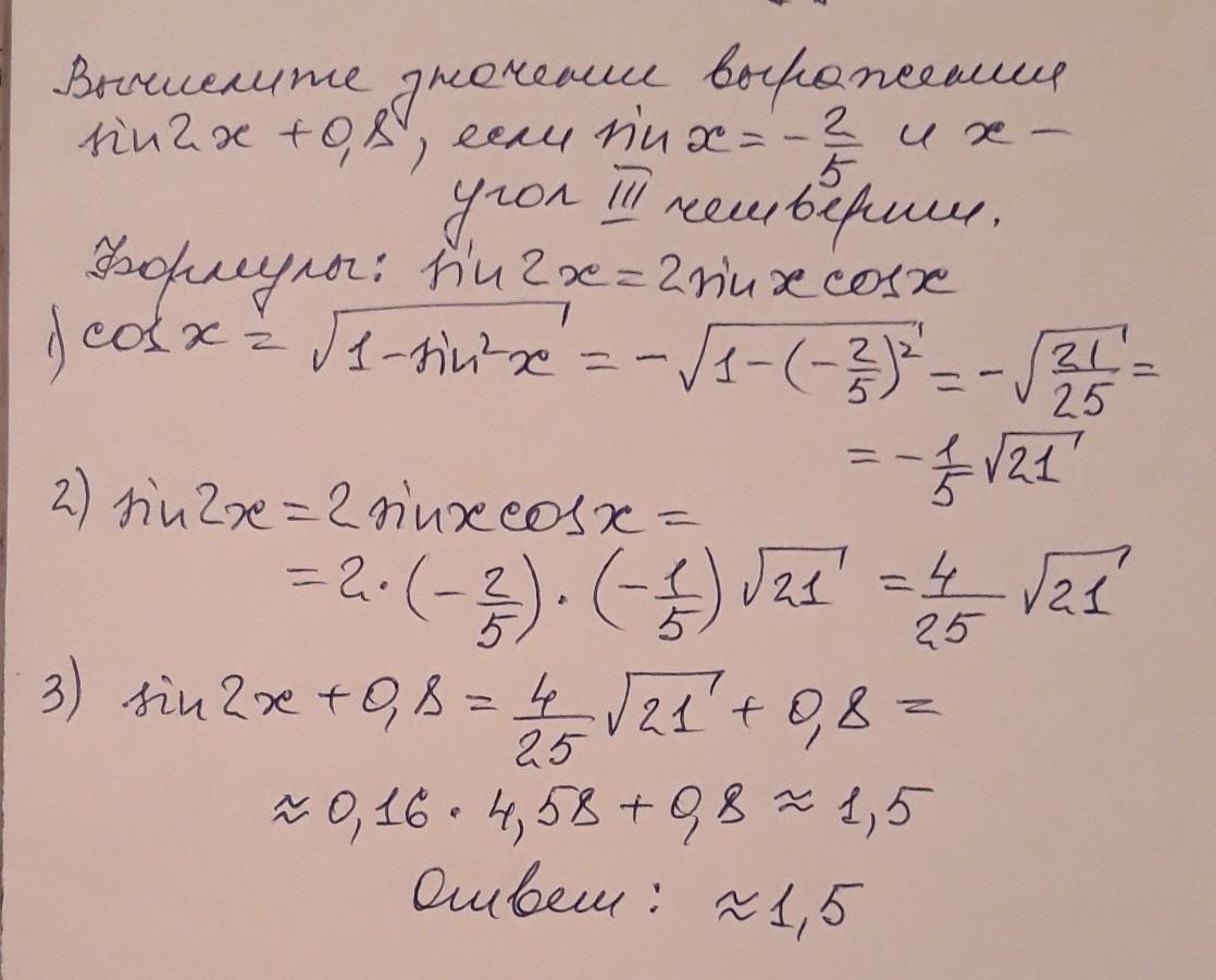 Вычислите значение выражения sin2x+0,8, если sinx=−25, x из 3 четверти