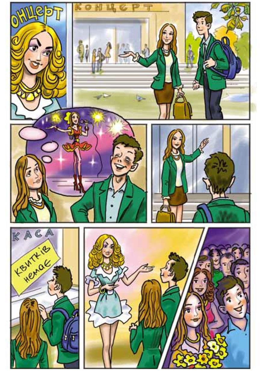 Повертаючись з навчання, Олена та Олег проходили повз концертний зал. Несподівано дівчина зупинилась. Сьогодні буде концерт відомої співачки Роксолани! Ця зірка, оквітачана популярністю та всенародною славою, була улюбленою артисткою Олени, тому та мріяла потрапити на її концерт.