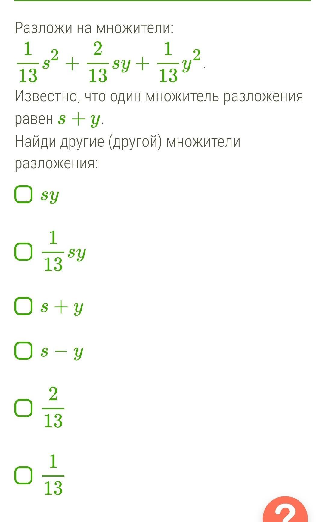 1/13s^2 + 2/13sy + 1/13y^2 = s^2 + 2sy + y^2 = (s+y)^2 = (s+y)(s+y)