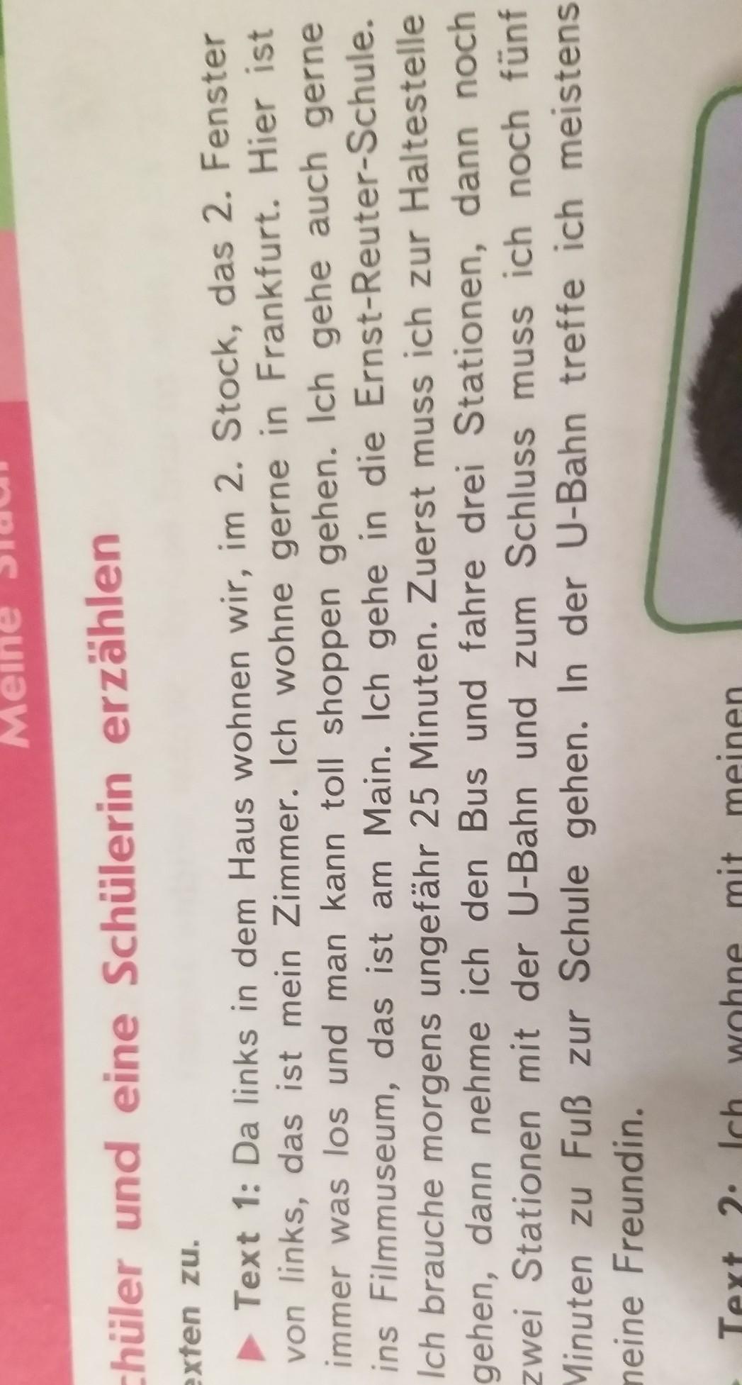 Мы живем в том доме слева, на втором этаже, второе окно слева, это моя комната. Мне нравится жить во Франкфурте. Здесь всегда что-нибудь происходит и здесь можно великолепно ходить по мгазинам. Я также люблю ходить в музей фильма, он находится на Майне. Я хожу в школу им. Эрнста Ройтера. Утром у меня уходит на дорогу около 25 минут. Сначала мне нужно дойти до остановки, затем я еду на автобусе 3 остановки, затем еще 2 остановки на метро и еще мне надо до школы идти пешком 5 минут. В метро я чаще всего встречаю мою подругу.