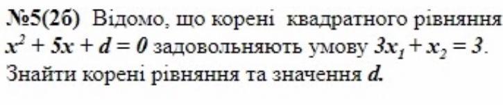 Відомо,що корені квадратного рівняння x^2+5x+d=0 задовольняють умову 3x снизу 1 +xснизу 2=3