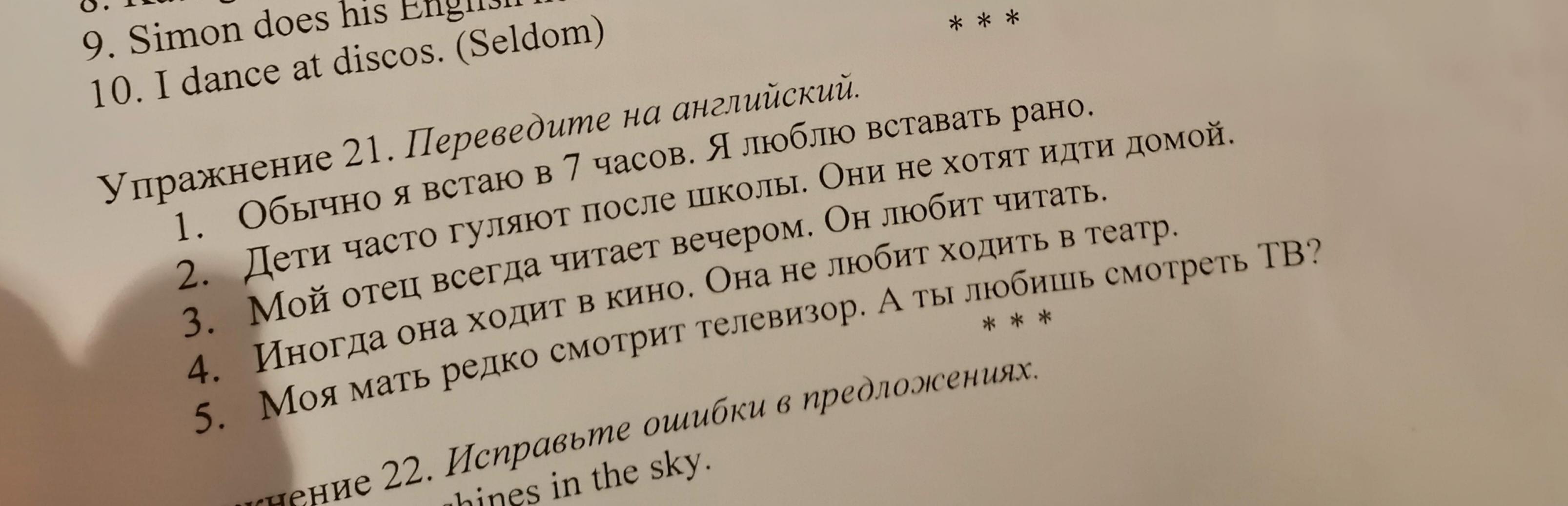 1.I usually get up at 7 in the morning. I like to get up early. Children often walk after school . They don't want to go home. my father always reads in the evening. He like to read. my mother rarely watches tv. Do you like to watch tv?