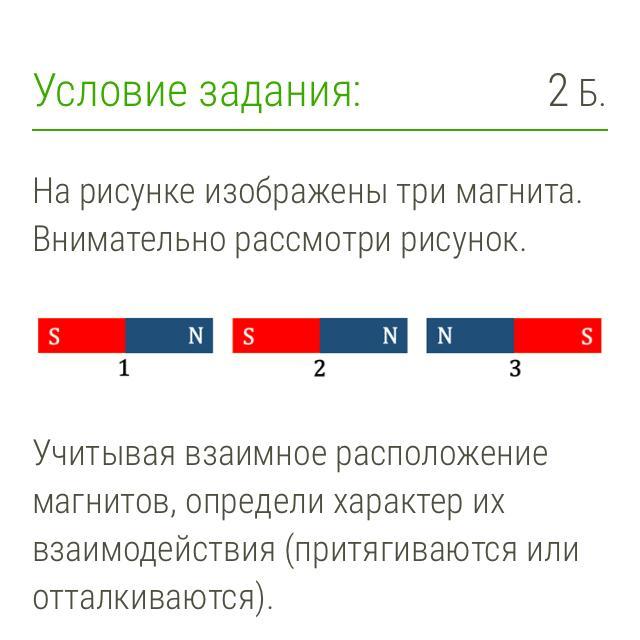 1) магниты 1 и 2 притягиваются, магниты 1 и 3 и магниты 2 и 3 отталкиваются.