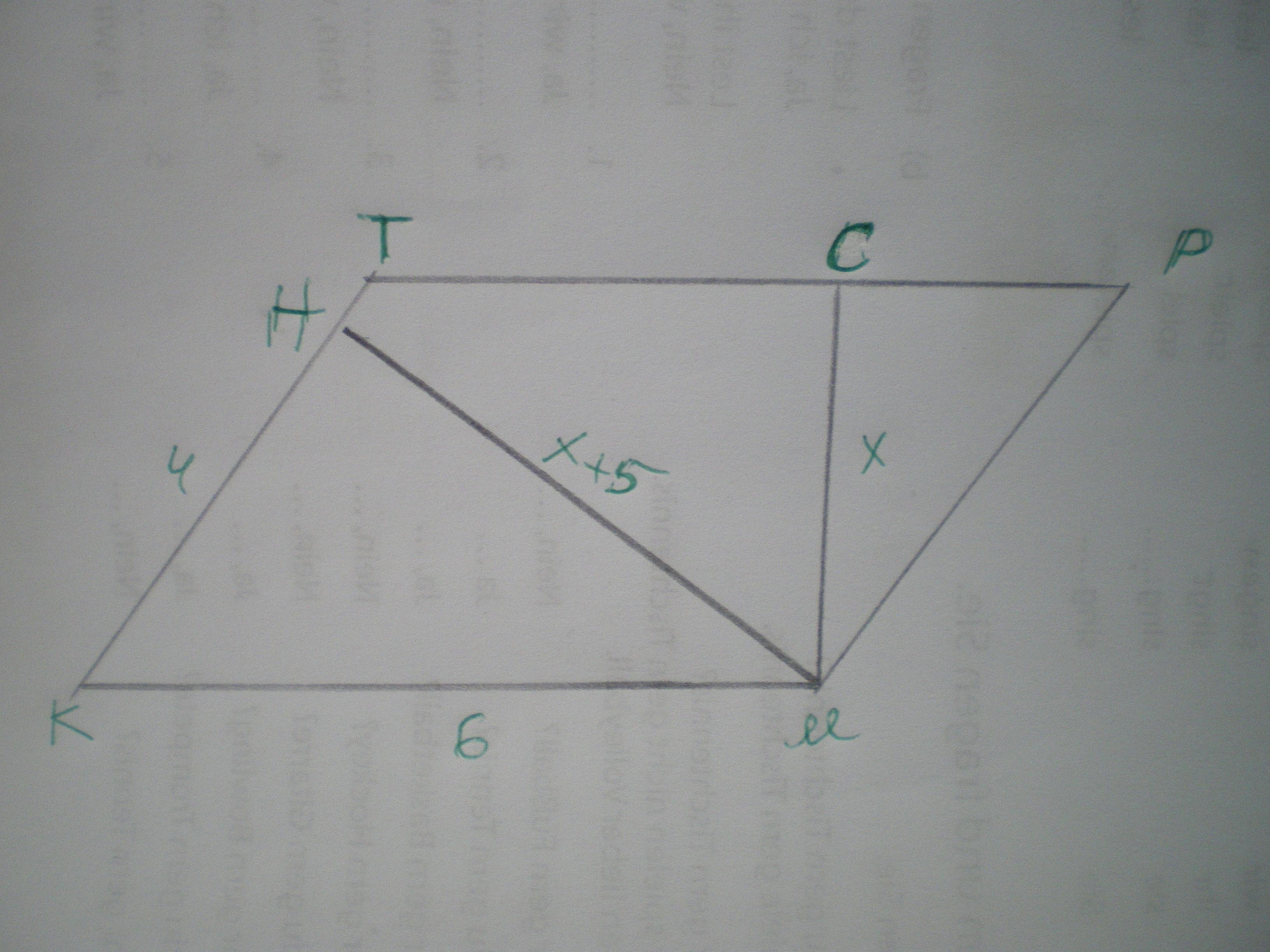 Менша висота паралелограма та, яка проведена до більшої сторони. Нехай КТ=4 см, ТР=6 см, висота МС=х см, висота МН=х+5 см.