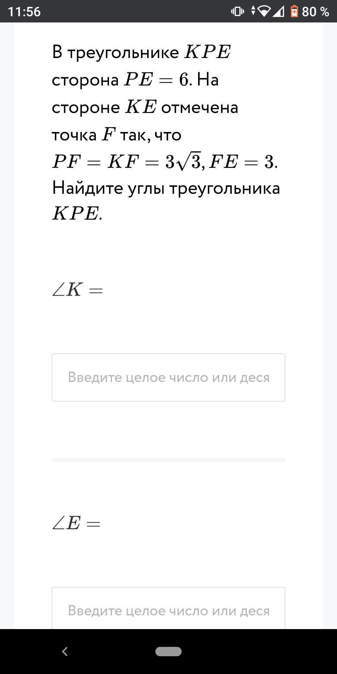 Задача: В треугольнике KPE сторона PE = 6. На стороне KE отмечена точка F так, что PF = KP = 3√3, FE = 3. Найти углы ΔKPE.