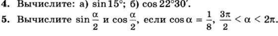 4); ; a); sin15^circ =sin(45^circ -30^circ )=sin45^circ cdot cos30^circ -sin30^circ cdot cos45^circ =\\=dfrac{sqrt2}{2}cdot dfrac{sqrt3}{2}-dfrac{1}{2}cdot dfrac{sqrt2}{2}=dfrac{sqrt6-sqrt2}{4}\\\b); ; cos22^circ30'=cosdfrac{45^circ }{2}=+sqrt{dfrac{1-cos45^circ }{2}}=sqrt{dfrac{1-frac{sqrt2}{2}}{2}}=sqrt{dfrac{2-sqrt2}{4}}=dfrac{sqrt{2-sqrt2}}{2}