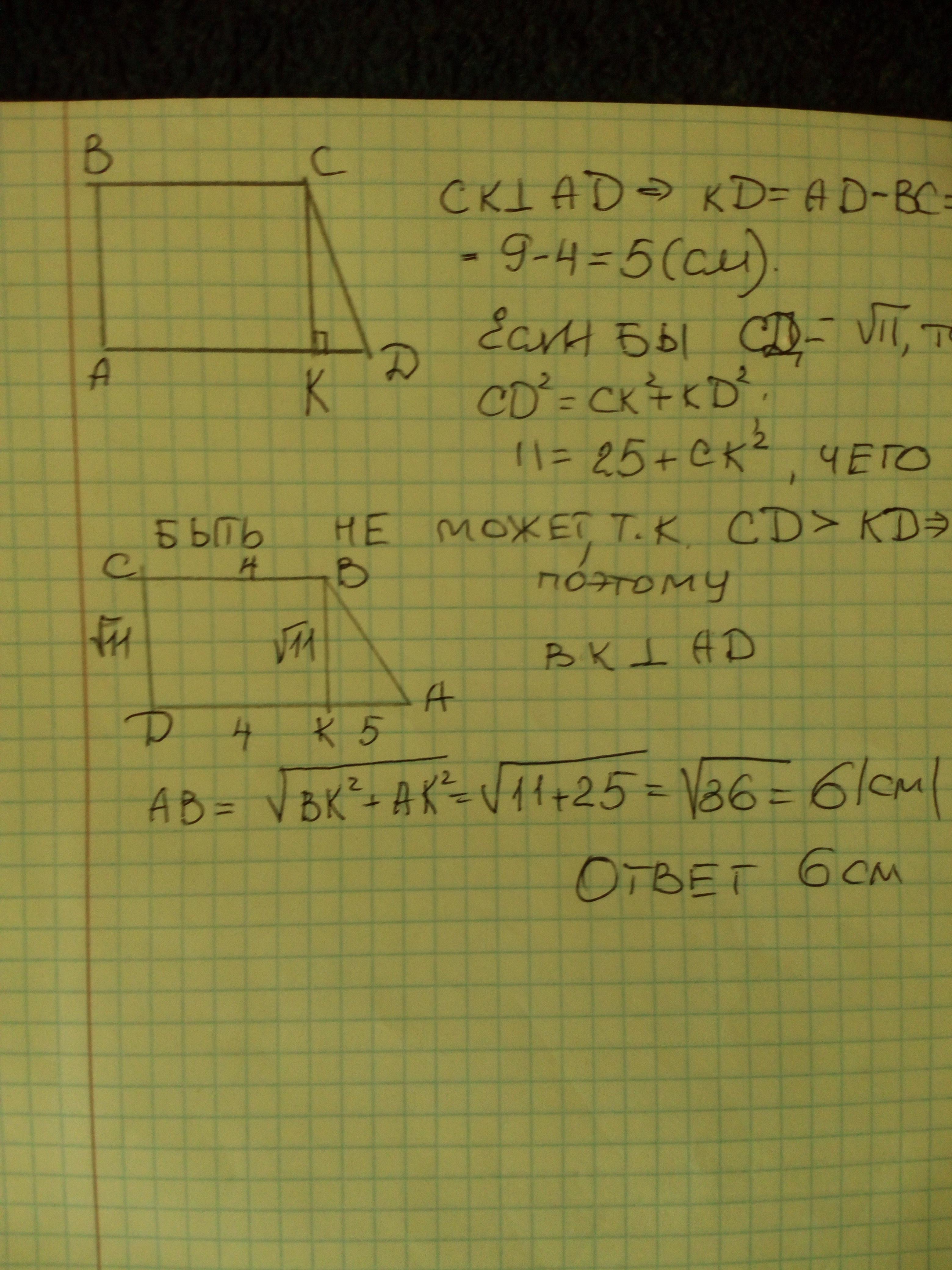 ABCD-прямоугольная трапеция (ВС||АD). Найдите длину большей боковой стороны, если ВС=4см, АD=9см, СD=√11