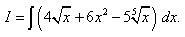 displaystyleint(4sqrt x+6x^2-5sqrt[5]x)dx=frac{8sqrt {x^3}}{3}+2x^3-frac{25sqrt[5]{x^6}}{6}+C\\intfrac{3}{2+2x^2}dx=frac{3}{2}arctgx+C\\intfrac{4}{13}x^5dx=frac{2x^6}{39}+C