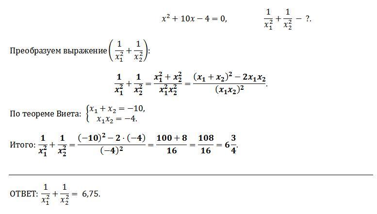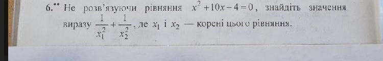 не розв‘язуючи рівняння x^2+10x-4=0 , знайдіть значення виразу 1/x(1)^2 + 1x(2)^2, де x(1) і x(2) - корені цього рівняння