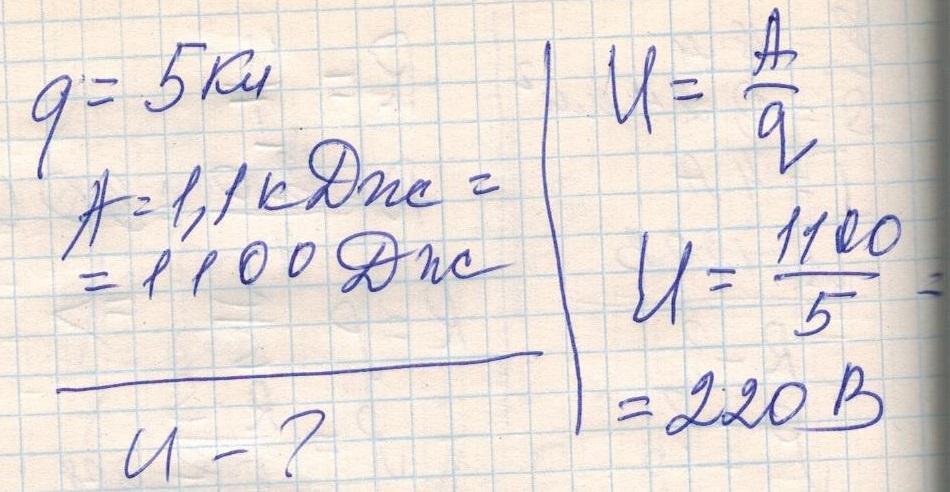 Яка напряга на кінцях провідника , якщо за проходження крізь нього заряду 5Кл виконується робота 1,1кДж?