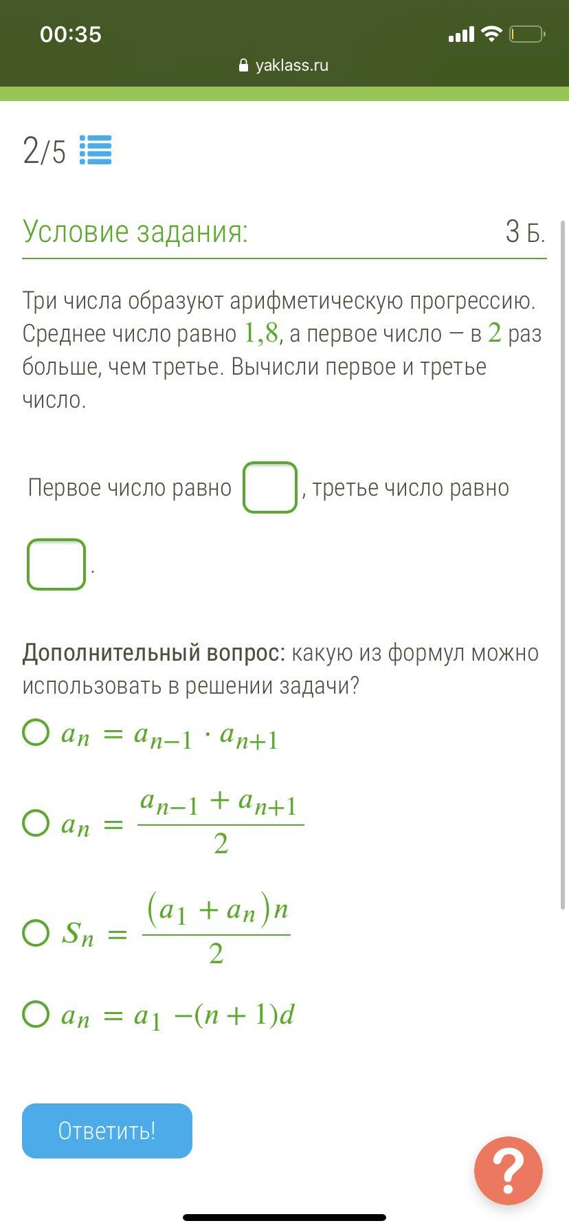 Три числа образуют арифметическую прогрессию. Среднее число равно 1,8, а первое число — в 2 раз больше, чем третье. Вычисли первое и третье число