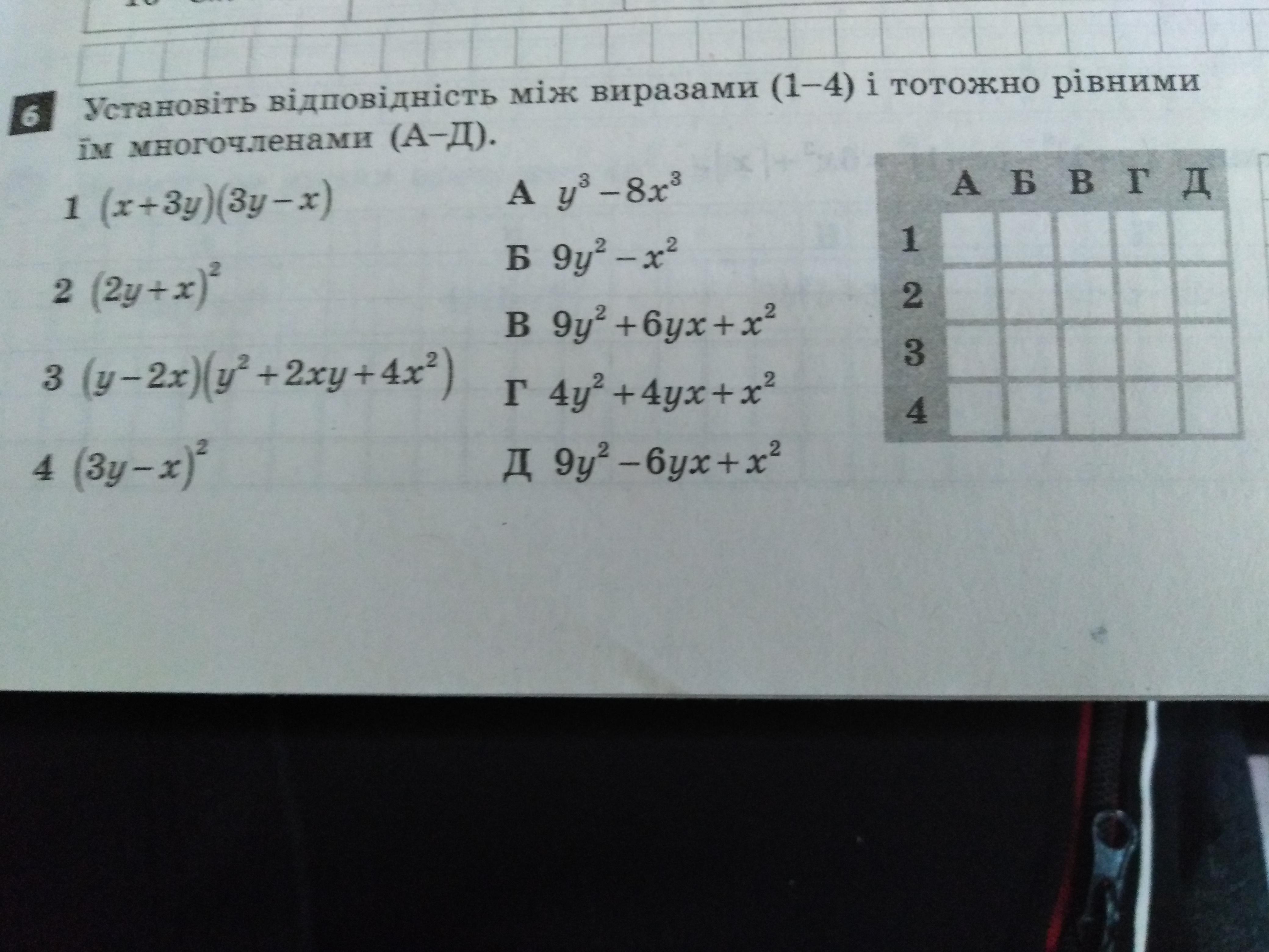 4. (3у-х)²=9у²-6ух+х² это Д