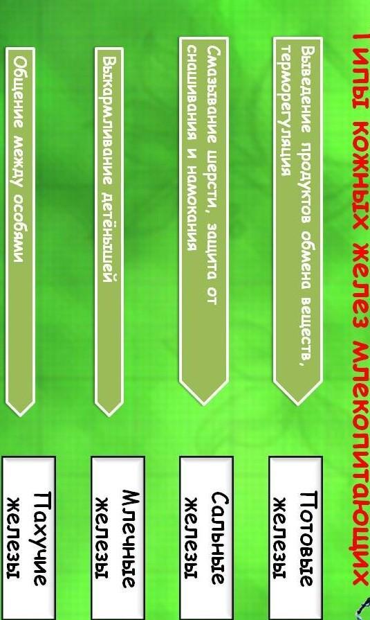 кроме гроздевидных сальных желез, есть трубчатые потовые железы. у многих зверей развиты пахучатые железы. а млечные железы -мводоизмененные потовые железы.