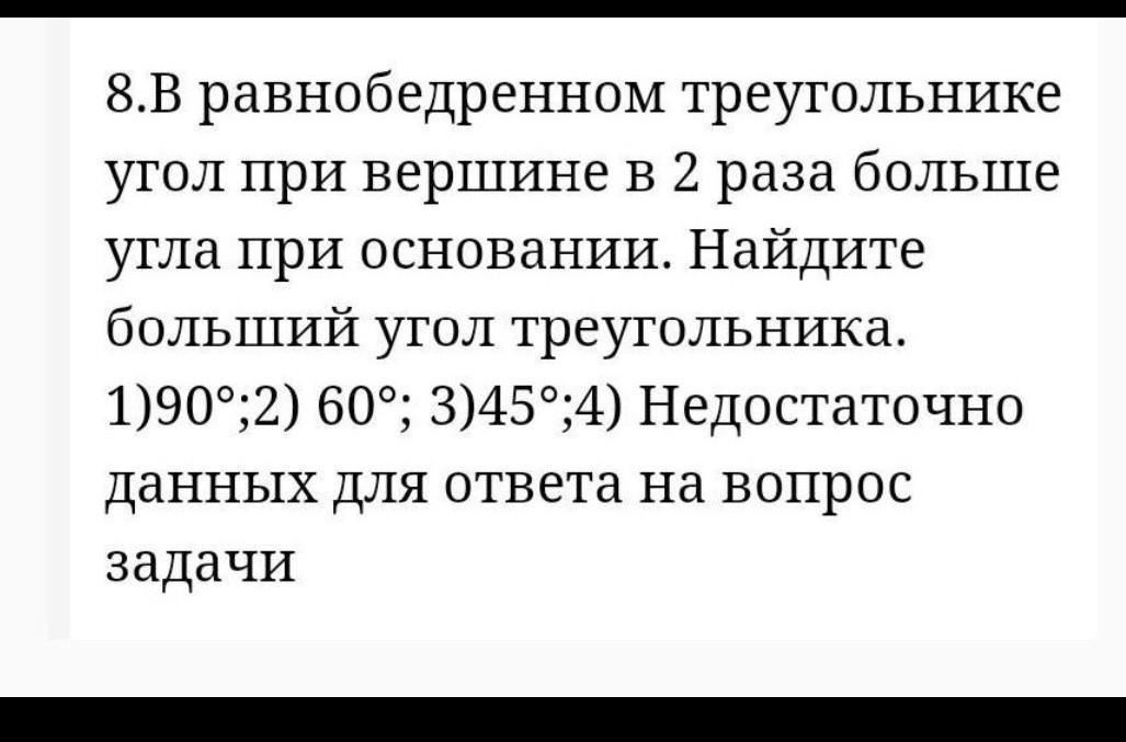 Угол в вершине в 2 раза больше угла при основании ⇒ 2 угла при основании = угол при вершине