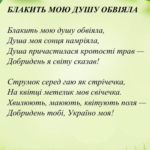 метафори:блакить...душу обвіяла, добридень я світу сказав