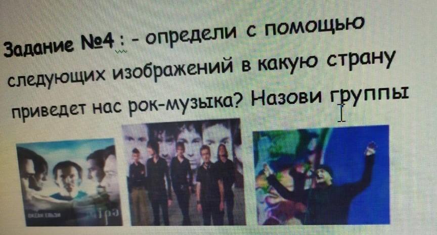 определи с помощью следующих изображений в какую страну приведёт нас рок-музыка .Назови группы.