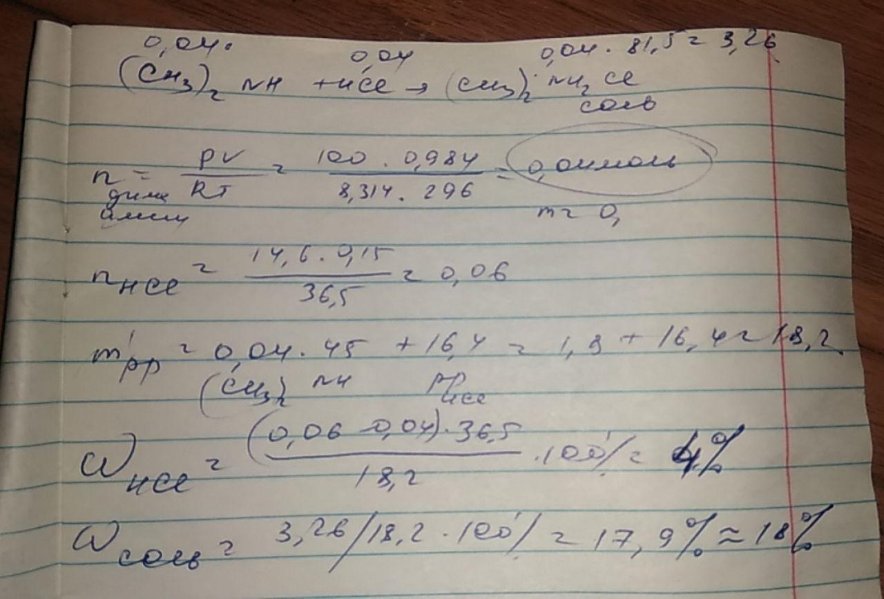 ПЛИИИИЗ!!Диметиламин объемом 984 мл (23°С, 100 кПа) пропустили через 15,0%-ю соляную кислоту массой 14,6 г. Рассчитайте массовые доли веществ в получившемся растворе.НЕ КОПИРУЙТЕ ПОЖАЛУЙСТА С ДРУГИХ САЙТОВ, ОТВЕТ: 21,5% --НЕ ПРАВИЛЬНЫЙ!