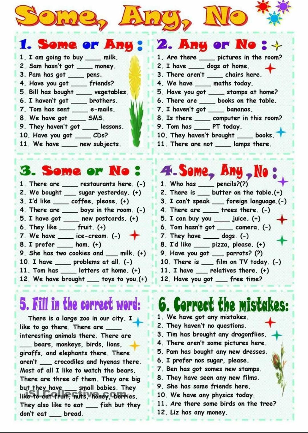 Ответ:1. some, any, some, any, some, any, some, some, any, any, some; 2.any, no, any, no, any, no, any, any, no, any, any; 3.no, some, some, no, some, some, no, some, some, no, some, some; 4.any, some, no, no, some, no, no, some, any, no, some, any; 5.some, some, any, no, some, any; 6.some, any, some, any, some, some, some, some, some, some, any, some