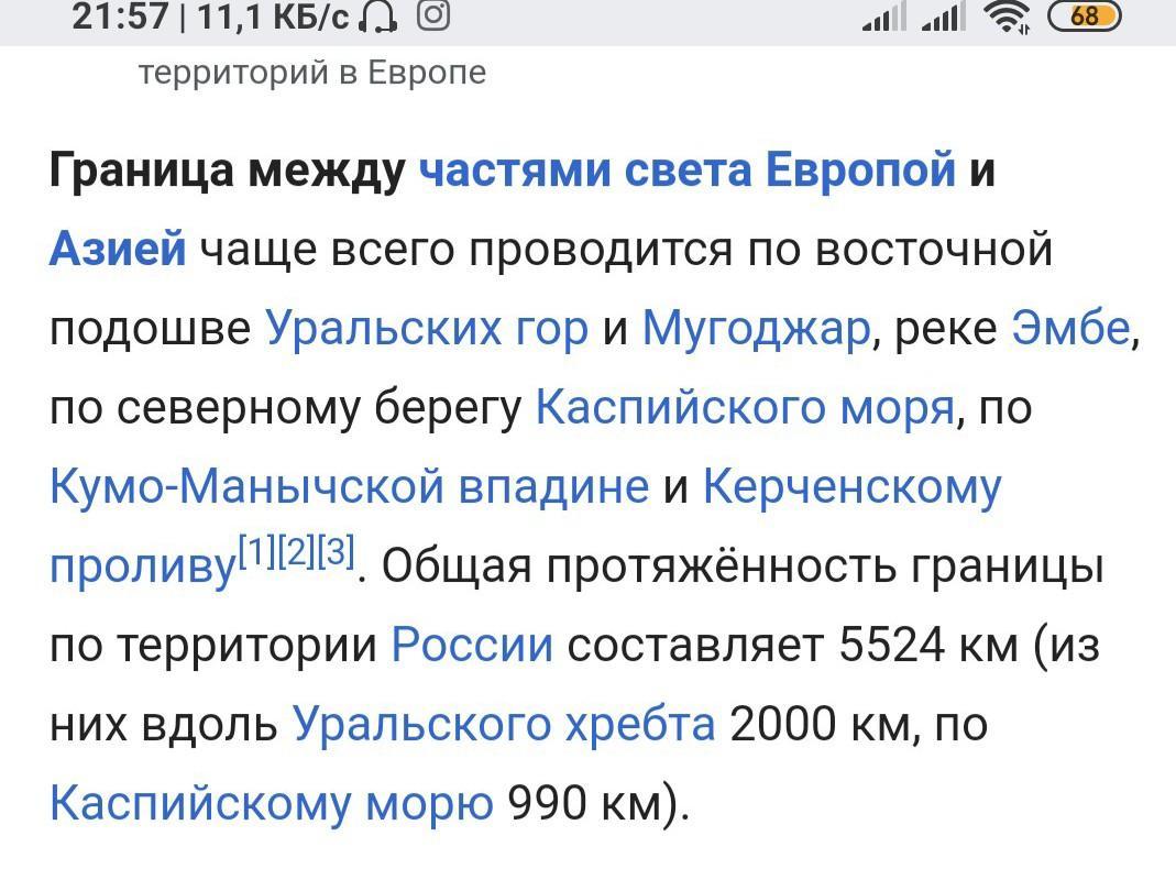 Є лінія межі між Європою і Азією і вона проходить: Уральські гори-р.Емба-північне узбережжя Каспійського моря-Кумо-Маничська западина -Азовське море, Керченська протока- Чорне море- протока Босфор- Мармурове море- протока Дарданеллы -Середземне море-Гібралтарська протока