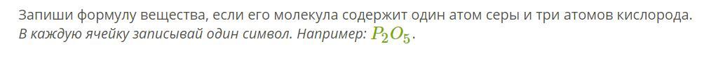 Запиши формулу вещества, если его молекула содержит один атом серы и три атомов кислорода. В каждую ячейку записывай один символ. Например: P205.