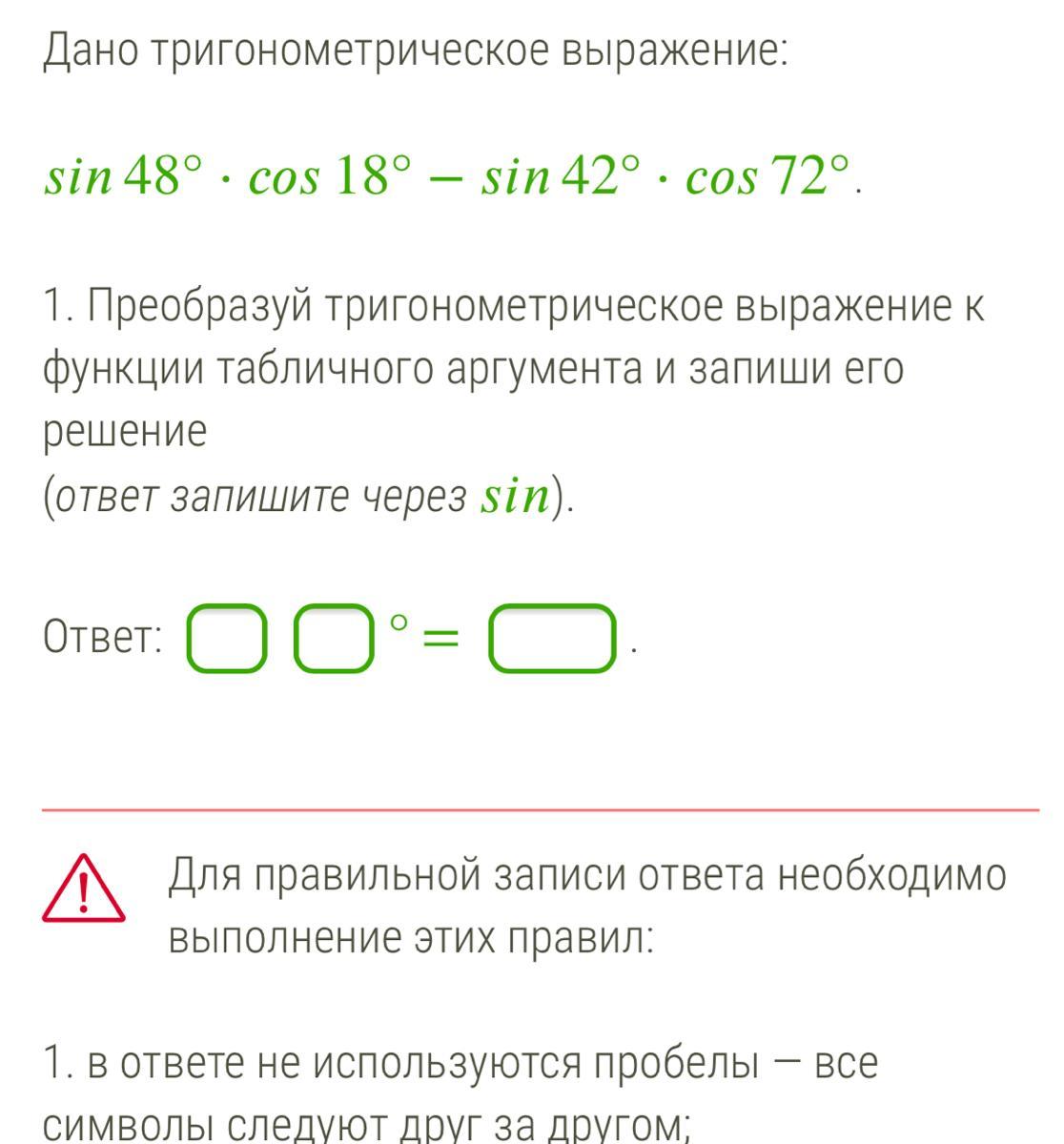 sin48°cos18°-sin42°cos72°=cos42°sin72°-sin42°cos72°=sin(72°-42°)=sin30°=0,5