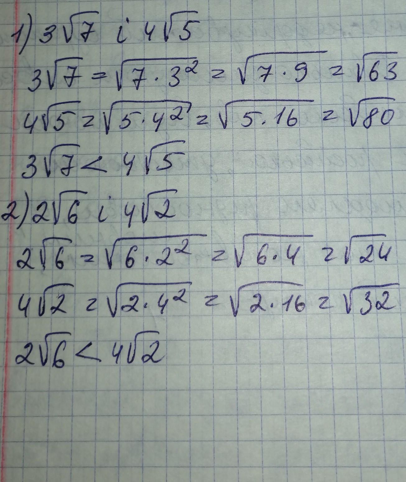 В первом 3 корень из семи больше чем 4 корень из пяти, потому что корень 80 больше чем корень 63. Во втором потому что корень 32 больше чем корень 24