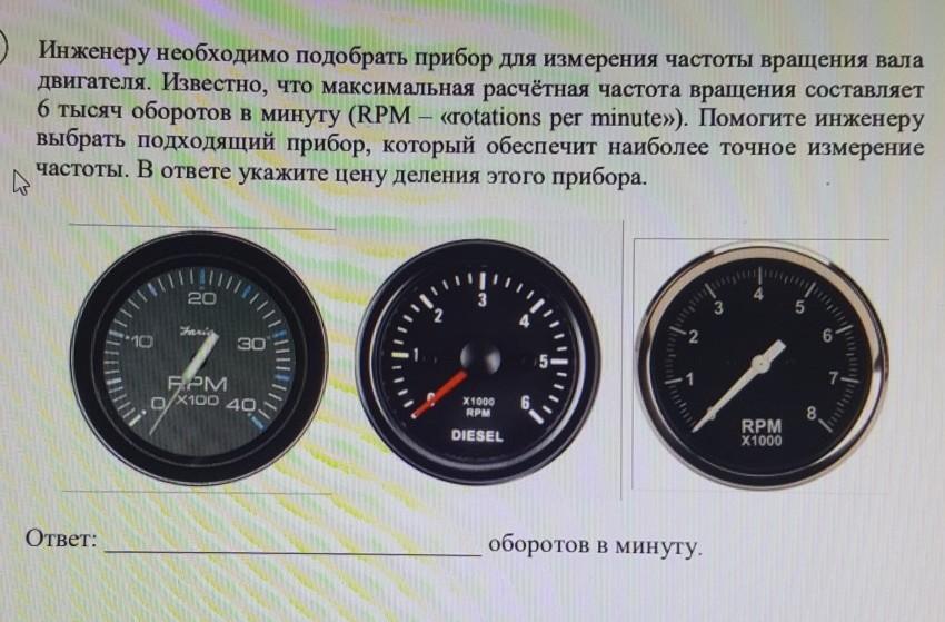 инженеру необходимо подобрать прибор для измерения частоты вращения вала двигателя. Известно, что максимальная расчётная частота вращения составляет 6 тысяч оборотов в минуту. Помогите инженеру выбрать подходящий прибор, который обеспечит наиболее точное измерение частоты. В ответе укажите цену деления этого прибора.