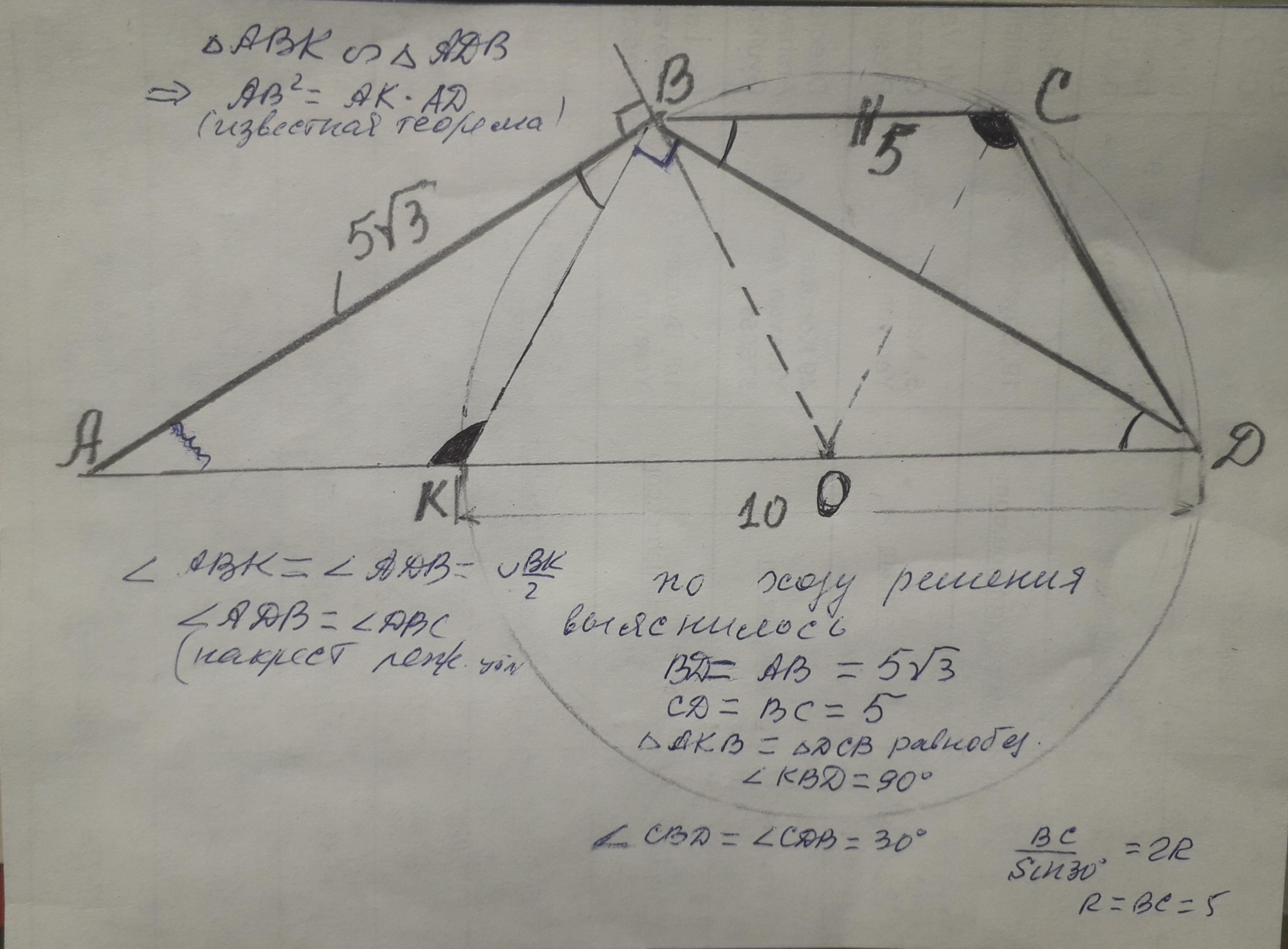 решение : Фактически нужно определить радиус окружности около трапеции KBCD. Очевидно трапеция равнобедренная ⇒ BK = DC и ∡BKD + ∡DCB =180°. Необходимо определить некоторые ее элементы