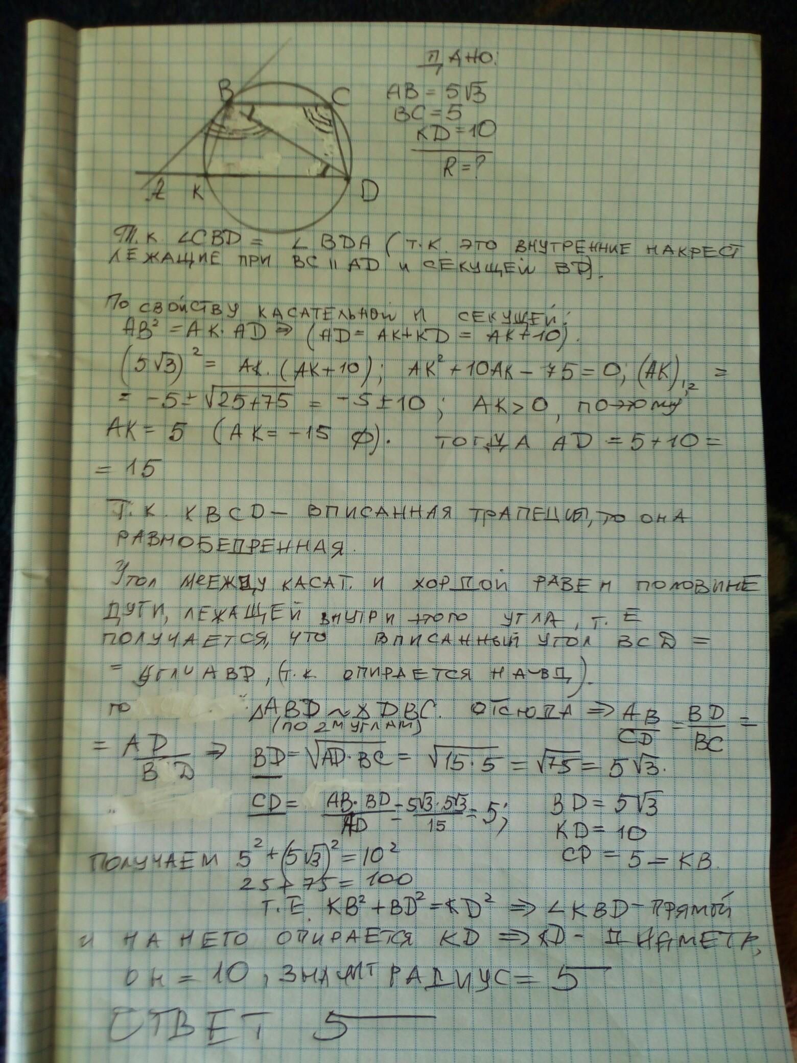* * * не так трудно радиус определить из равнобедренного ΔBKD со сторонами BC=CD=5 ; BD=5√3 * * *