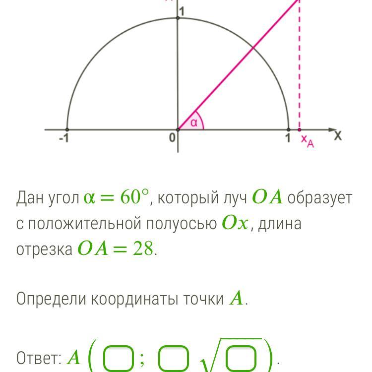 AB=OA*sin60=28*V3/2=14V3 (V-корень), AB=ординате точки А