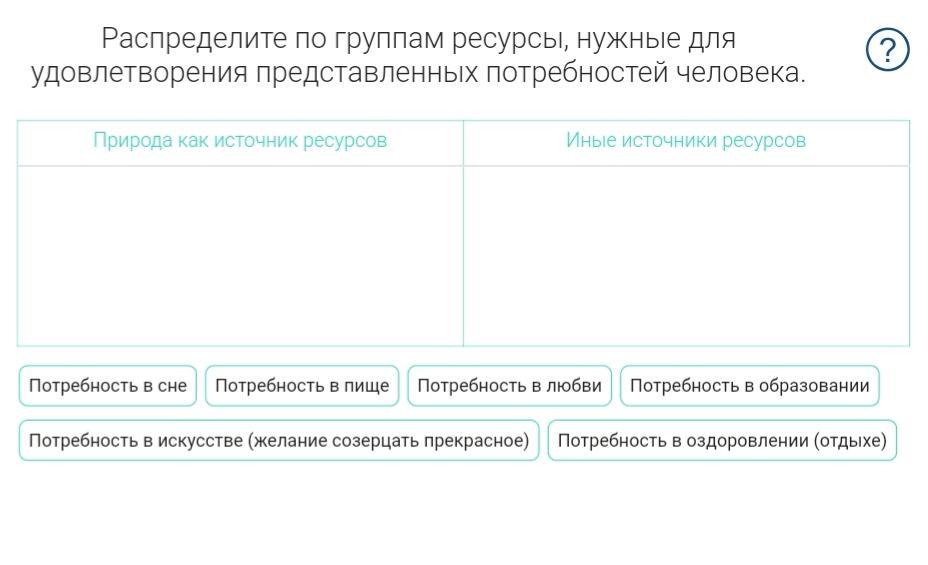 Распределите по группам ресурсы, нужные для удовлетворения представленных потребностей человека.