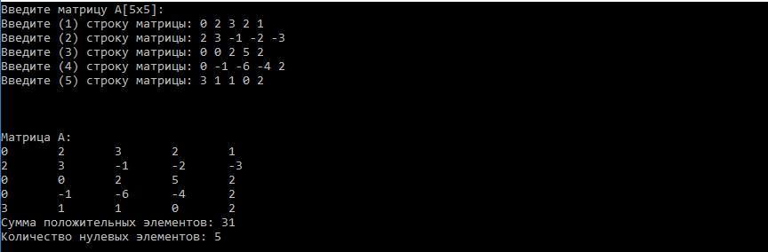 // Задаем матрицу A и сразу считаем сумму положительных элементов и количество нулевых
