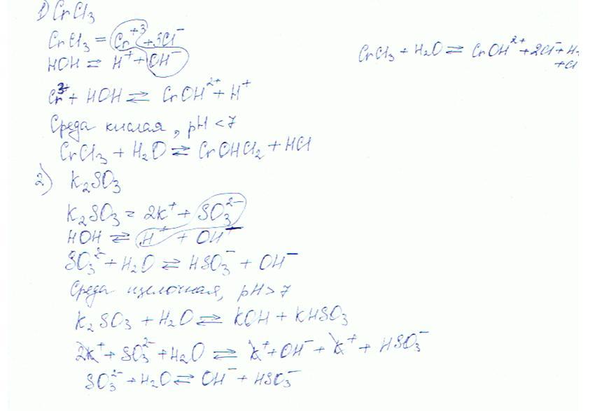 Выбрать из предложенного ряда солей те, которые в водном растворе подвергаются гидролизу. Составить для них уравнения реакций гидролиза в ионной и молекулярно-ионной формах: CrCl3, NaClO4, K2SO3