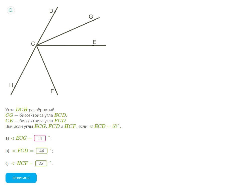 Вычисли углы ECG, FCD и HCF, если ∢ECD=57°