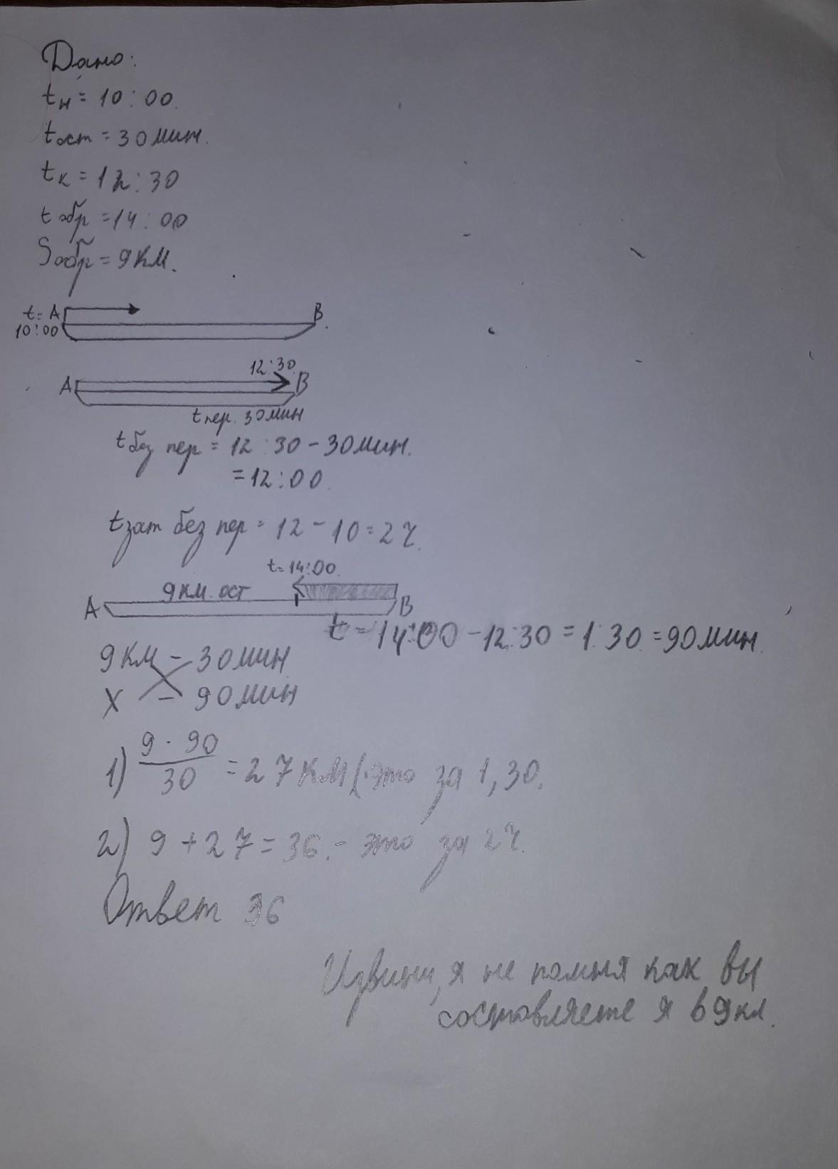 остановку на полчаса, а в 12:30 выехал обратно с прежней скоростью. В 14:00 ему оставалось