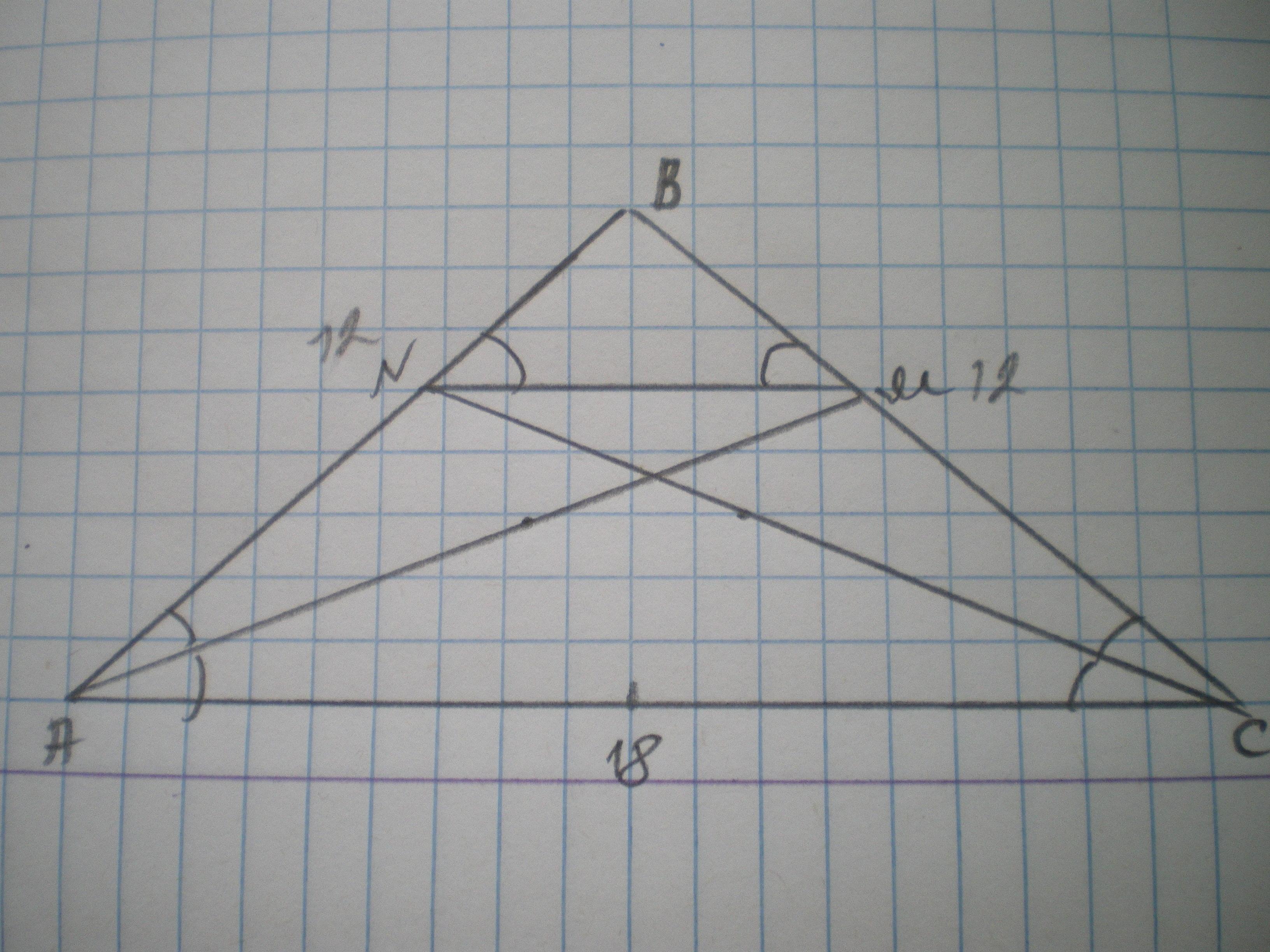 AM і CN бісектриси кутів при основі рівнобедренного трикутника ABC, сторони якого дорівнюють 12 см, 12 см і 18 см. Знайдіть довжину відрізка MN