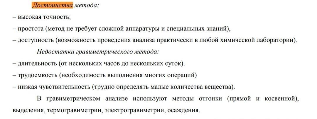Гравиметрия – наиболее точный из химических методов анализа. Точность определения составляет в среднем 0,1–0,2%, иногда 0,005–0,01%. Кроме того, метод отличается надежностью полученных результатов. Благодаря этим достоинствам метод используют при проведении наиболее ответственных и требующих точности аналитических работ