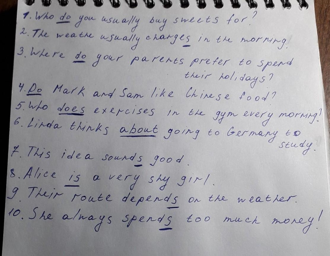1) Who you usually buy sweets for? 2) The weather usually change in the morning. 3) Where your parents prefer to spend their holidays? 4) Does Mark and Sam like Chinese food? 5) Who do exercises in the gym every morning? 6) Linda thinks of going to Germany to study. 7) This idea is sounding good. 8) Alice is being a very shy girl. 9) Their route is depending on the weather. 10) She is always spend too much money!