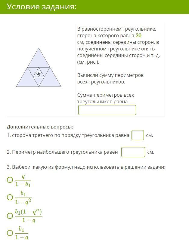 Данные треугольники подобны, так как сторона каждого последующего треугольника равна половине предыдущего, как средняя линия треугольника. Значить, периметр каждого последующего треугольника равен половине предыдущего. Из чего следует,что эти периметры образуют бесконечную геометрическую прогрессию со знаменателем q=0,5. b₁=P=3·20=60 см
