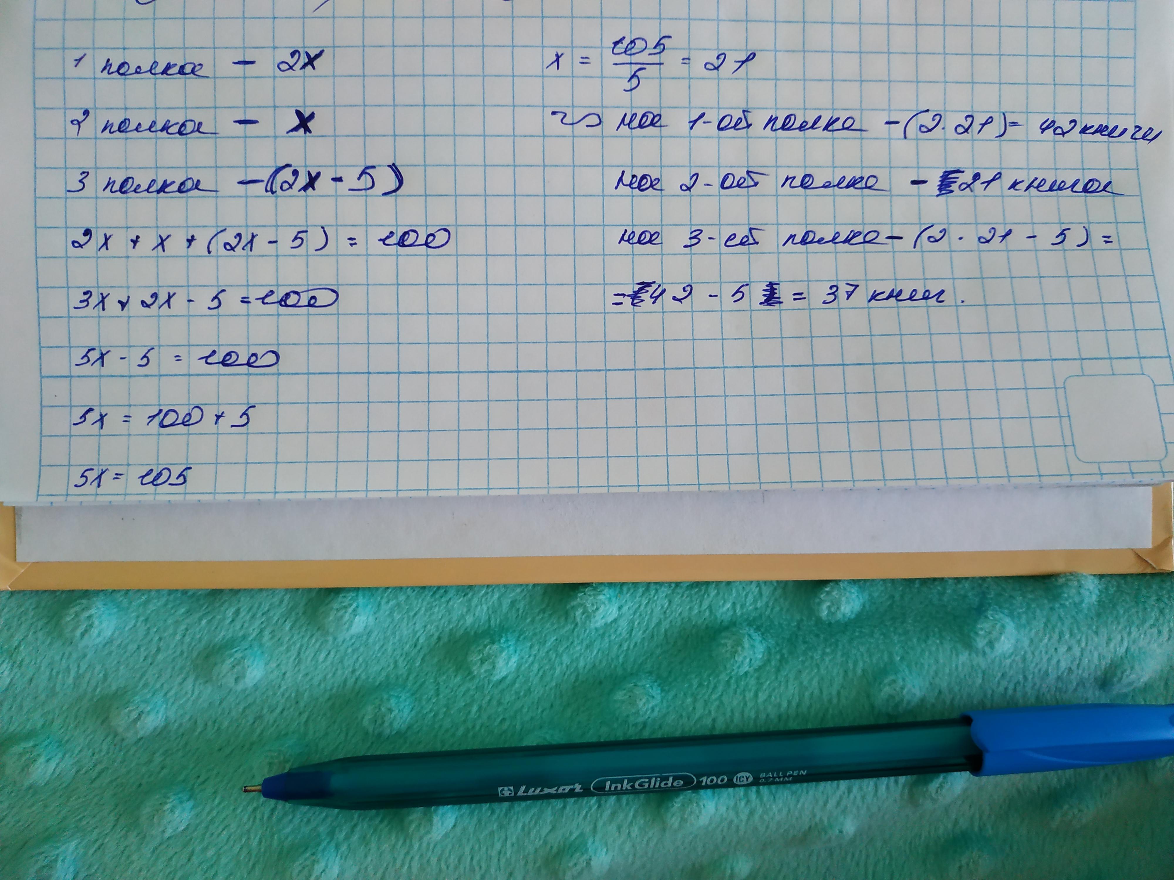 Объяснение: первую полку берём за 2х так как она больше второй в 2 раза, а вторую просто за 2х, третье полку берём за 2х-5( меньше второй полки на 5) Суммируем кол. Книг и равно 100, получаем уравнение 2х+х+2х-5=100