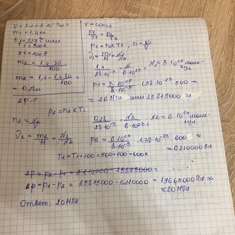 Срочно!!!!! В баллон емкостью V=8 л поместили азот массой m1=1,4 кг при температуре t1=227°C. На сколько изменится давление азота в баллоне при повышении температуры на Δt=100 °C, если 80% азота будет выпущено?