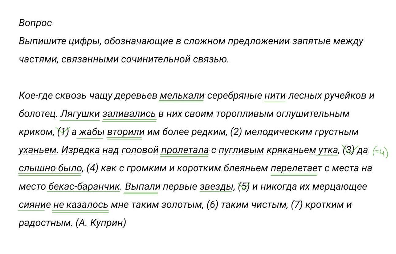 Кое-где сквозь чащу деревьев мелькали серебряные нити лесных ручейков и болотец. Лягушки заливались в них своим торопливым оглушительным криком, (1) а жабы вторили им более редким, (2) мелодическим грустным уханьем. Изредка над головой пролетала с пугливым кряканьем утка, (3) да слышно было, (4) как с громким и коротким блеяньем перелетает с места на место бекас-баранчик. Выпали первые звезды, (5) и никогда их мерцающее сияние не казалось мне таким золотым, (6) таким чистым, (7) кротким и радостным. (А. Куприн)