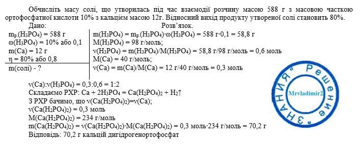Обчисліть масу солі, що утворилась під час взаємодії розчину масою 588 г з масовою часткою ортофосфатної кислоти 10% з кальцієм масою 12г. Відносний вихід продукту утвореної солі становить 80%.