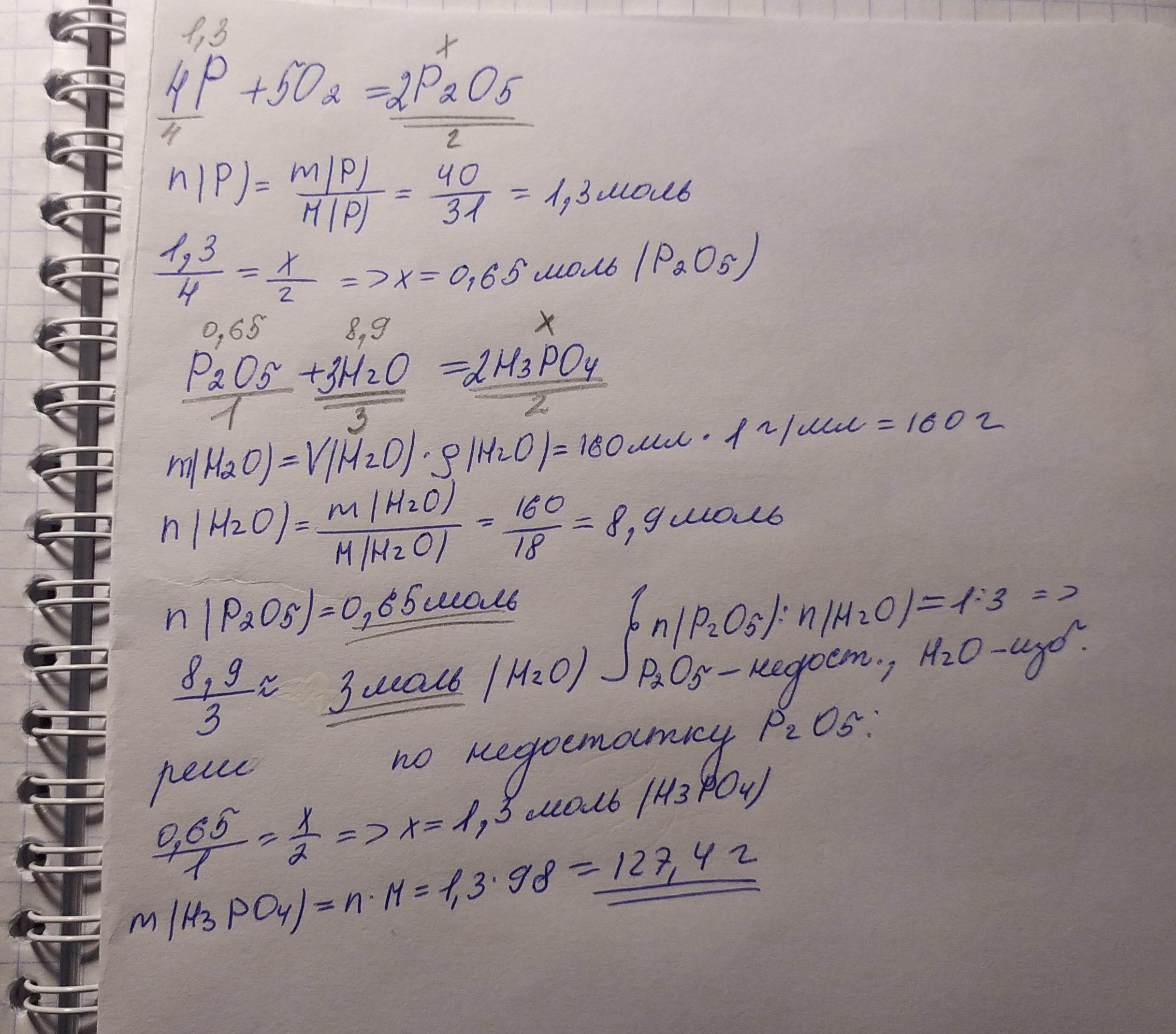 Фосфор (V) оксид, одержаний при спалюванні фосфору масою 40 г, розчинили у воді об'ємом 160 мл. Визначте масову частку ортофосфатної кислоти в такому розчині.