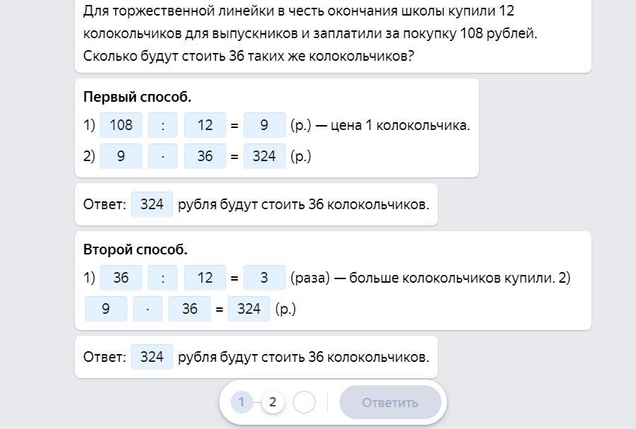 Для торжественной линейки в честь окончания школы купили 12 колокольчиков для выпускников и заплатили за покупку 108 рублей. Сколько будут стоить 36 таких же колокольчиков?