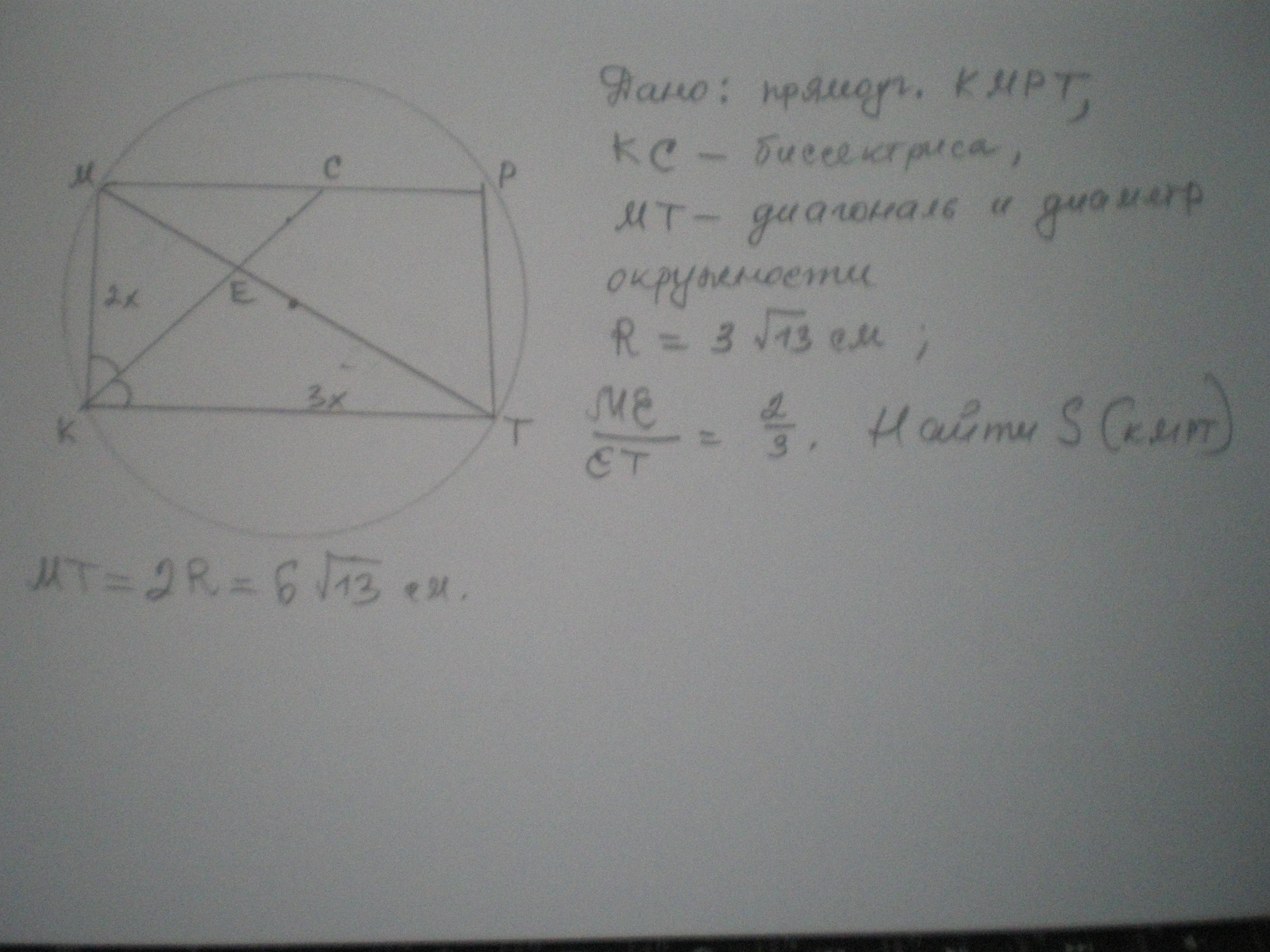 Условие: Биссектриса угла прямоугольника делит его диагональ в отношении 2: 3, а радиус описанной окружности равен 3√13 см. Найдите площадь прямоугольника.