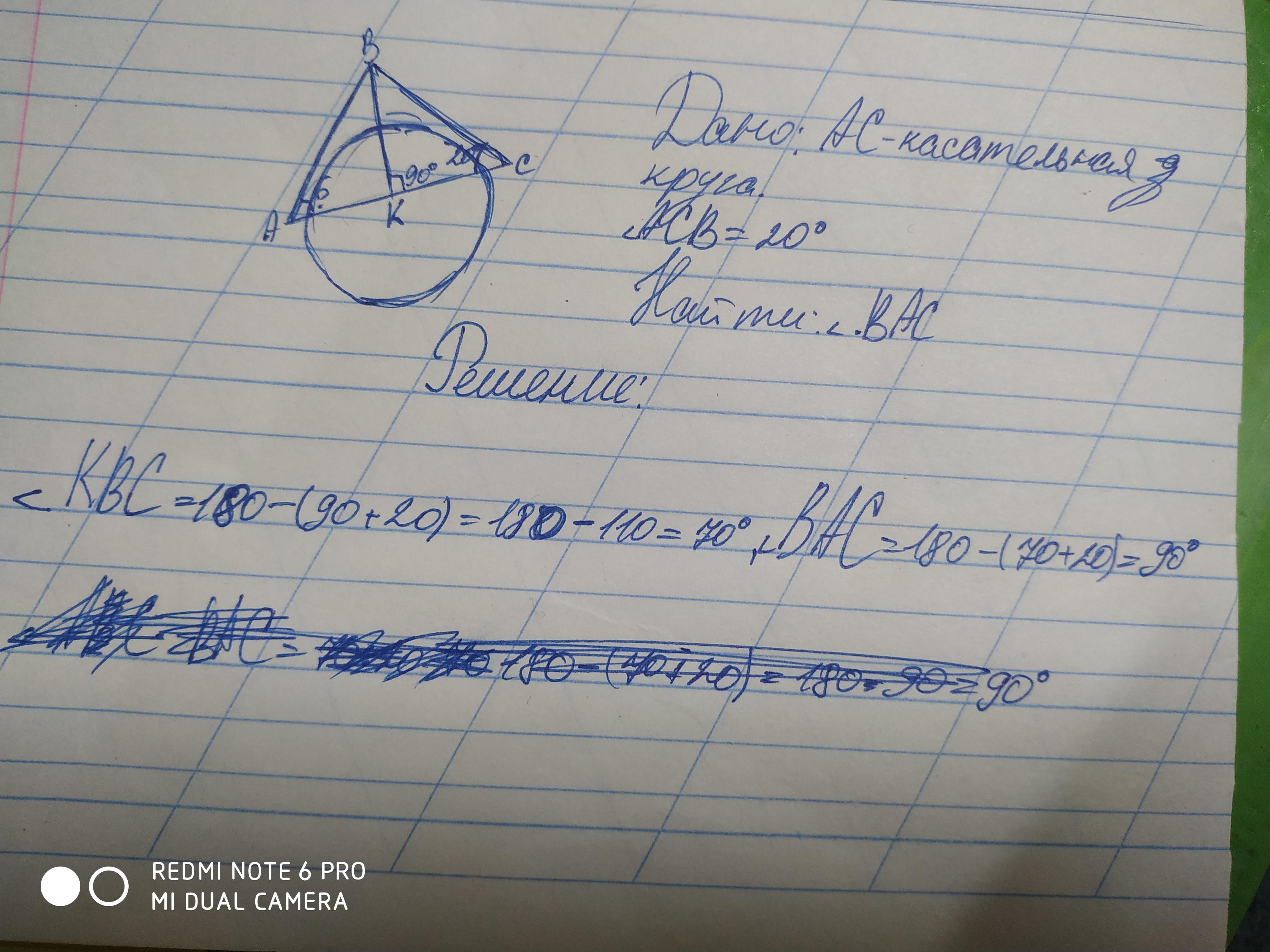 Объяснение:мы провели биссектрису угла АВС в итоге мы получили ВКС=ВКА=90°. Нам известно что угос АСВ=20° И решаем: