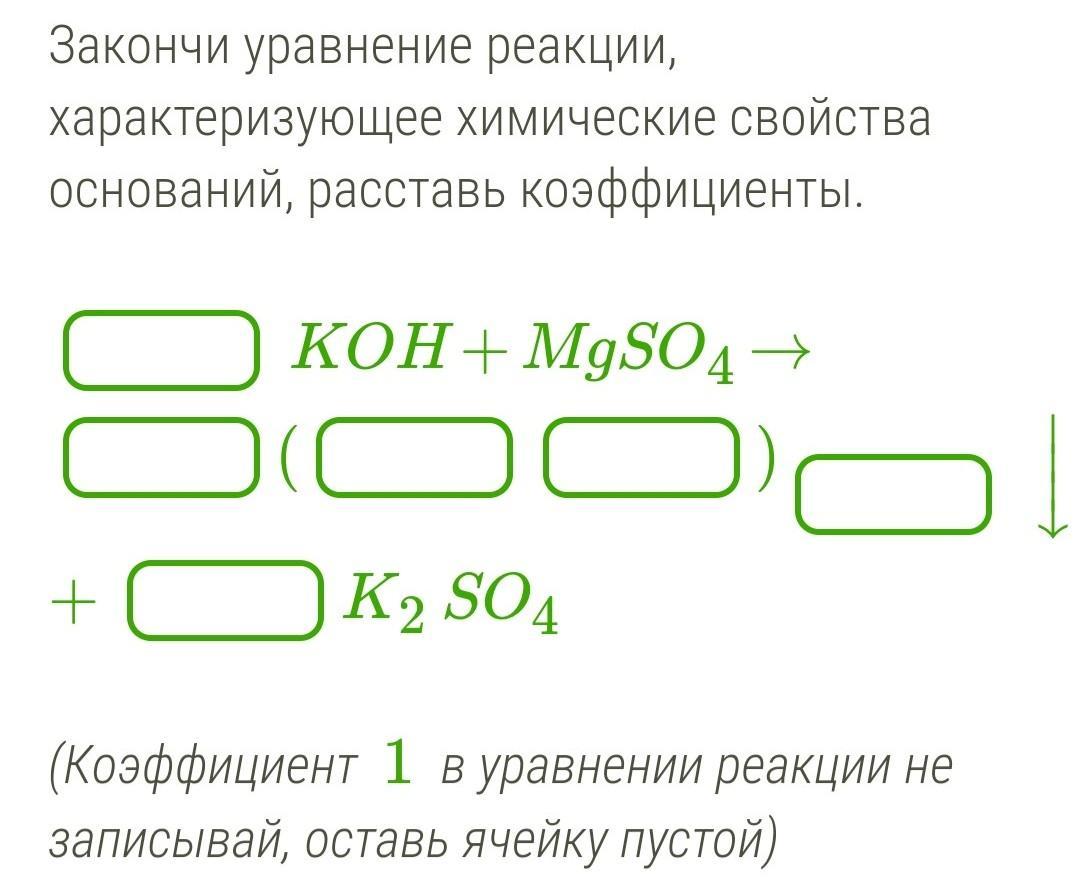 Закончи уравнение реакции, характеризующее химические свойства оснований, расставь коэффициенты
