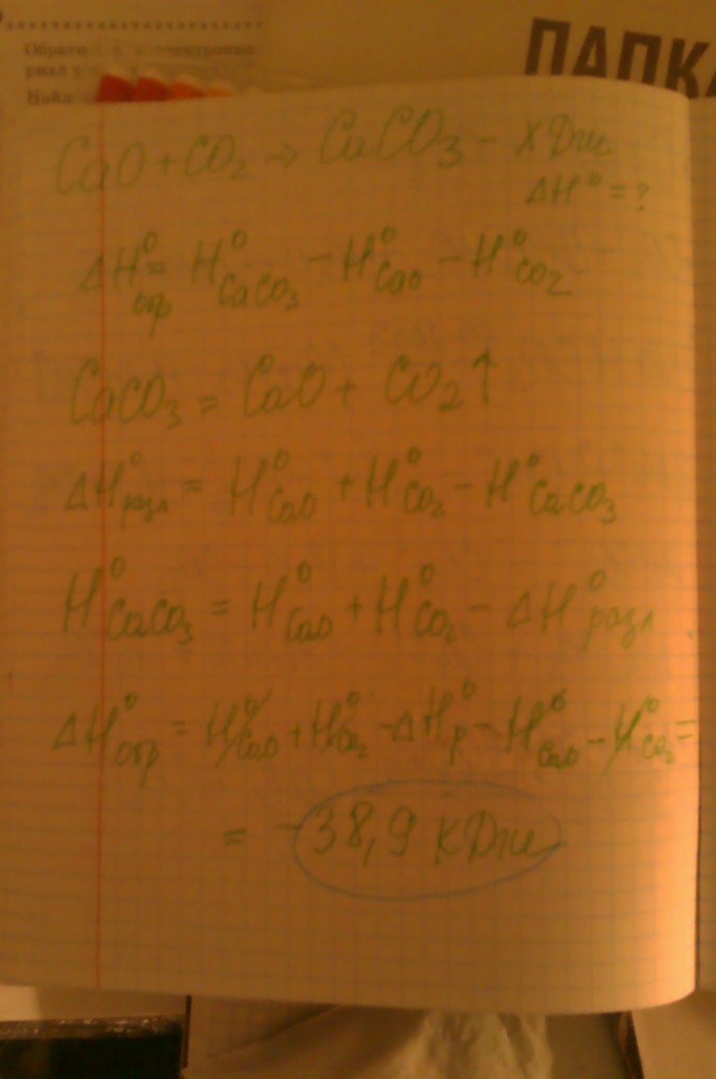 вычислить энтальпию образования карбоната кальция,если известно,что энтальпия образования оксида кальция и диоксида углерода,соответственно , равны -150,6 и 94,0 кДж/ моль, а при реакции разложения карбоната кальция на эти оксиды поглощается 38,9 кДж.