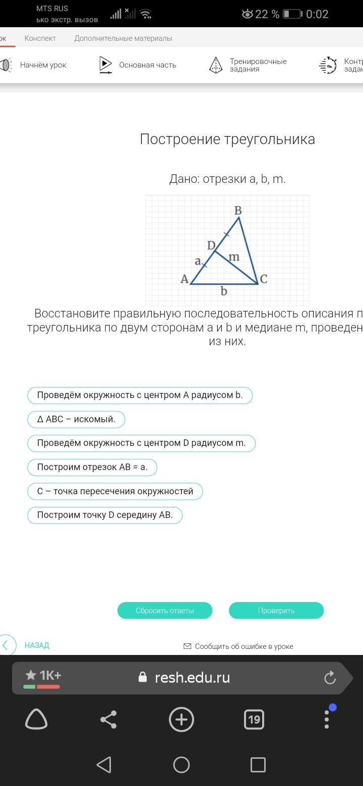 Восстановите правильную последовательность описания построения треугольника по двум сторонам а и b и медиане m, проведенной к одной из них.
